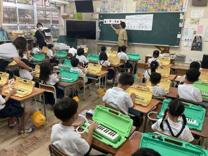 1年生は音楽で鍵盤ハーモニカの学習をしています。リズムに合わせて音を出す練習です。
