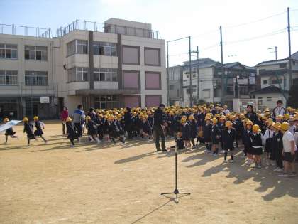 今回は、地震の後に津波が発生するかもしれない想定で、いつもの避難訓練のように運動場に避難した後に、校舎の3階に避難し、津波の危険が去ったのち集団下校する訓練でした。