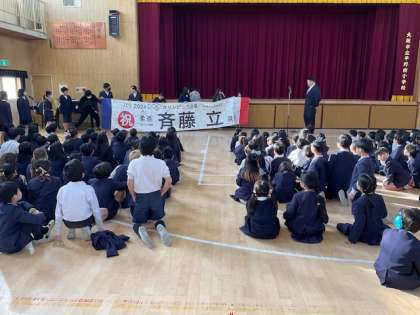 オリンピック開催中に学校に掲示していた横断幕には子どもたちの寄書きをし、斉藤選手へプレゼントさせていただきました。