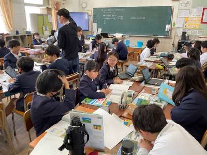 5年生では、社会科の学習で「低い土地の産業」について、グループで調べ学習をしていました。