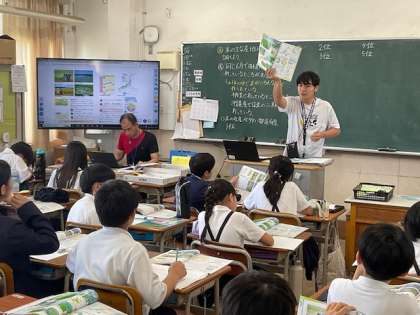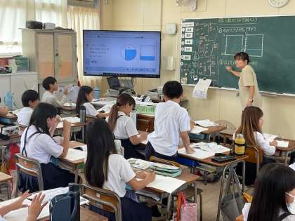 5年生では、社会科で「米の主な生産地」について学習していました。地図やグラフから情報を読み取っていました。