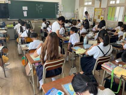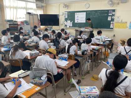 5年生では、家庭科で「裁縫」の学習をしていました。玉どめ・玉結び・なみ縫いの練習をしていました。得意な子が近くの子に優しく教え合う場面がありました。