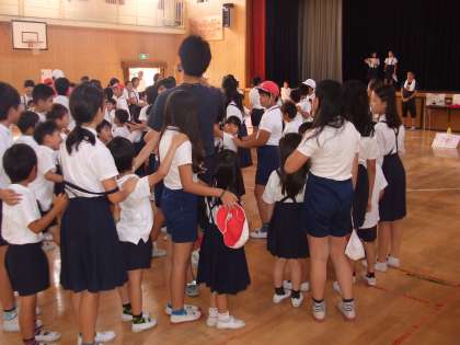 8:35からの朝の活動の時間には、児童朝会だけでなく読書タイムやチャレンジタイムなど曜日ごとに活動があります。水曜日は、異学年交流の場としてペア集会が行われます。進行は集会委員会さんが務めます。今日は1・6年生のペア集会で、「じゃんけん列車」で楽しんでいる様子です。(写真では分かりにくいですが、ゲーム後半で列車が大分長くなっています。)