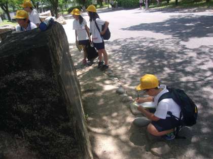 6年生の学習の大きな柱に「平和学習」があります。その一環として6月10日(金)に大阪城周辺のフィールドワークに出発しました。実は大阪城とその周辺にはたくさんの戦跡が残されています。それらをグループに分かれて調べ学習を行いました。午後からは隣接するピースおおさかでの見学でした。気温が高い厳しい条件でしたが、熱心にメモをとる姿が多くみられ、充実した1日となりました。