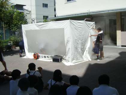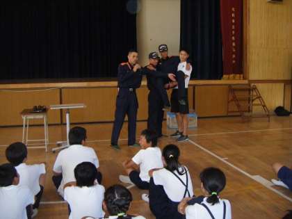 6年生も平野消防署の消防士さんから防災授業を受けました。6年生は煙体験だけでなく、実際に災害に遭遇し、けがをしたりして動けなくなっている人の救助の仕方についても学びました。
