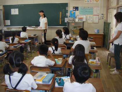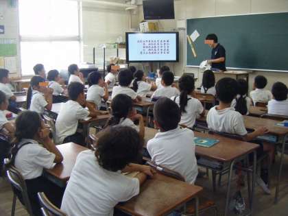 3年生1組は国語の勉強で、大型モニターに映し出されたひらがなの一覧表を見ながら、国語の学習をしていました。何やらとてももりあがっていました。