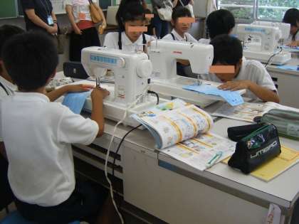 2組は、家庭科室でミシンを使って裁縫の学習。