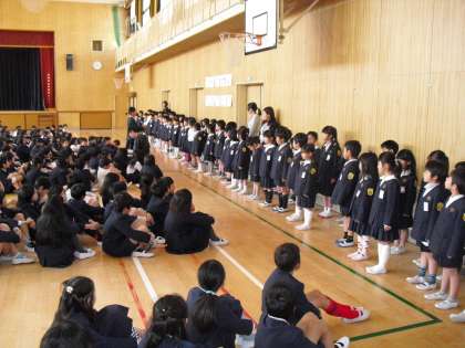 児童代表から「歓迎の言葉」を聞いた後、1年生は元気よく「お返しの言葉」を声をそろえて言いました。