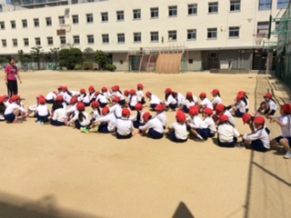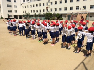 元気に運動場に集まりました。みんな話しを聞いてくれて(?)います。これから体操をして始めます。