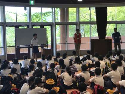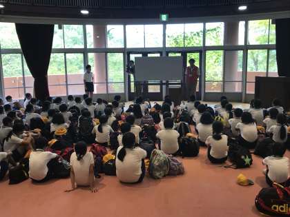 11:30 入所式。しっかりとスタッフさんのお話を聞いて、暑さ対策をとり、行動開始です。