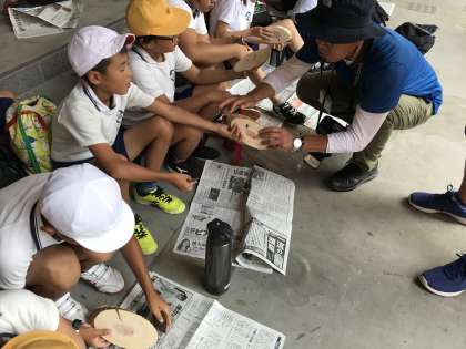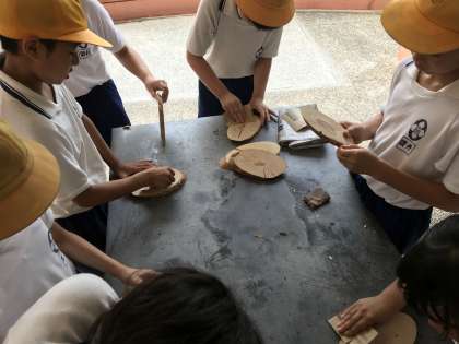 13:00昼食をとり、クラフト工作に取り組んでいます。ただ今、いため板をペーパーで、削っています。汗だくです!ガンバレ。