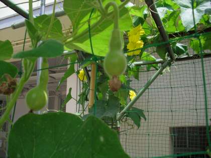 ひょうたん(小さな実ができています。大きく育ってほしいですね。)