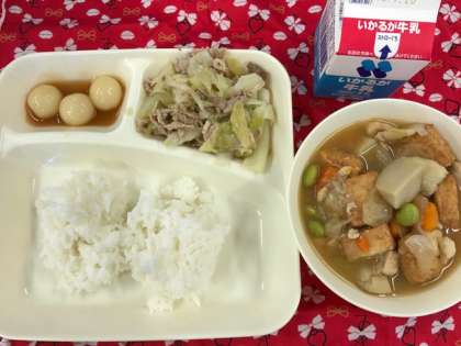 9月19日(水)の給食は、お月見の行事こん立として“ごはん・牛乳・鶏肉とさといもの煮もの・豚肉とキャベツのいためもの・みたらしだんご”が出されました。
