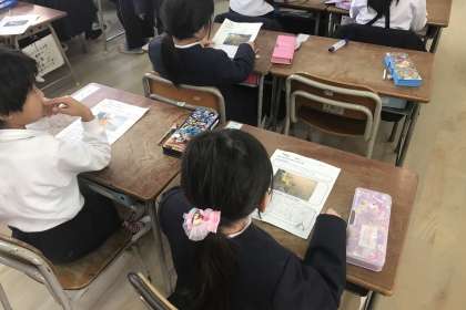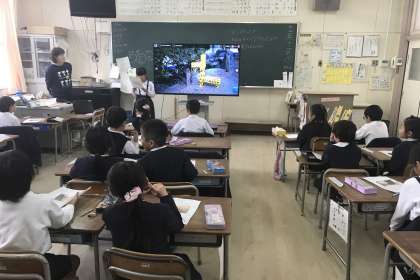 1年図工科指導案のもと、単元「はこでつくったよ」の学習をしました。動物の図工作品を校庭のいろんな場所におき、タブレットを使って撮影して、写真を見せながら、自分の作品を紹介したり、むずかしいところなどを、発表しあいました。