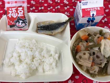 2月4日(月)の給食は節分の行事こん立、「ごはん・牛乳・いわしのしょうがじょうゆかけ・含め煮・いり大豆」でした。
