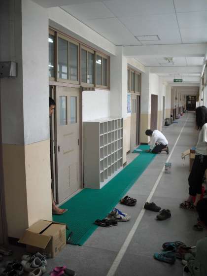 学校図書室の整備を続けていますが、今回、靴箱を新しくし、靴を脱いで歩くところにマットをしきました。