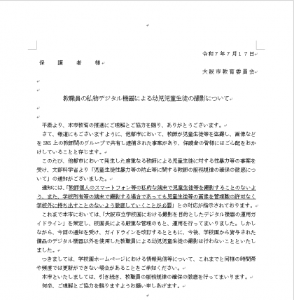 林間学習5年生でもお知らせしましたように、7月の「大阪市立学校園における撮影を目的としたデジタル機器運用ガイドライン」の改正により、教職員による児童の撮影は学校から貸与された備品のデジタル機器のみになっております。それに伴い、今回の修学旅行の様子のホームページ更新につきましては、昨年のようにリアルタイムでアップロードすることができません。修学旅行から帰校した後に、順次現地の様子をアップロードさせていただきますので、趣旨ご理解いただきますようお願いいたします。