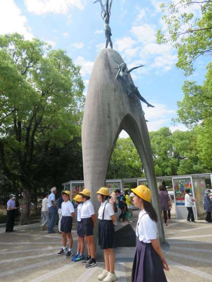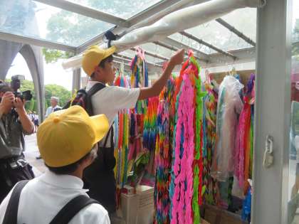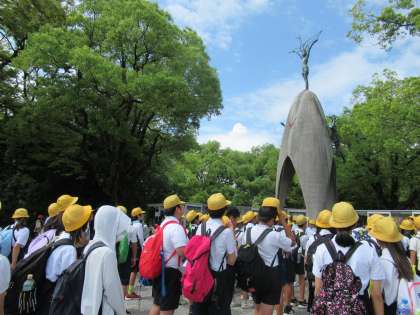 原爆の子の像の前で平和集会を行い、学校全員で折った千羽鶴を奉納しました。