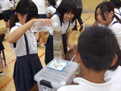 次にグループに分かれて、水のろ過の実験を実際に行いました。