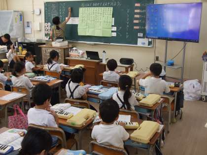 1年生では、音楽科で鍵盤ハーモニカの学習をしていました。グループで合わせて演奏するために、みんな一生懸命練習していました。