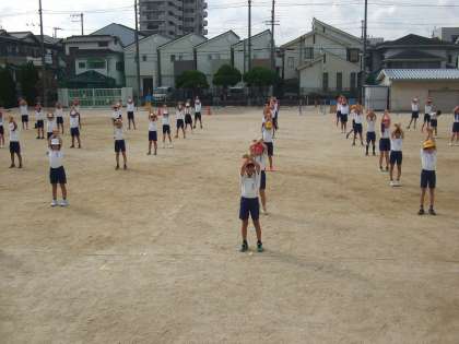 4年生では、体育科で運動会の団体演技の練習をしていました。運動場で隊形移動の確認をしていました。