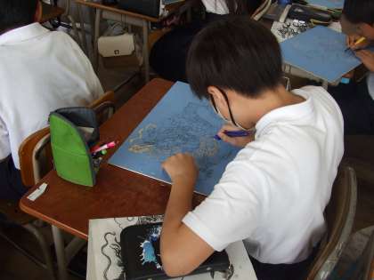 5年生では、図画工作科で「木版画」の学習をしていました。細かい模様を集中して彫り進めていました。