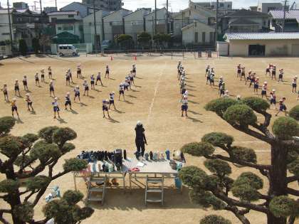 2年生では、体育科で運動会の団体演技の練習をしていました。手首にキラキラしたバンドをつけて踊っていました。運動会に向けて最終調整をしていました。