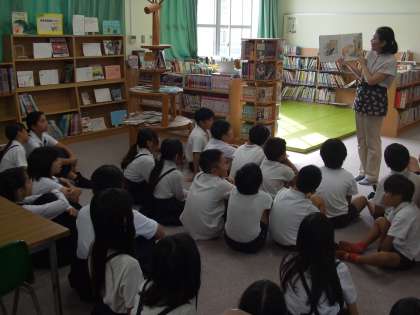 4年生では、図書の学習をしていました。学校司書の先生が読み聞かせをしてくれ、絵本の世界に入り込んでいました。