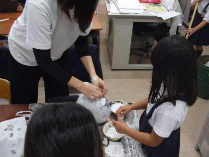 1年生では、図画工作科で紙を貼り合わせて謎の球体を作成していました。どんな作品ができあがるか完成が楽しみですね。