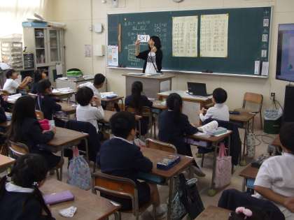 2年生では、算数科で「かけ算九九」の学習をしていました。フラッシュカードを使用してかけ算九九を覚えていました。元気な声が教室に響いていました。