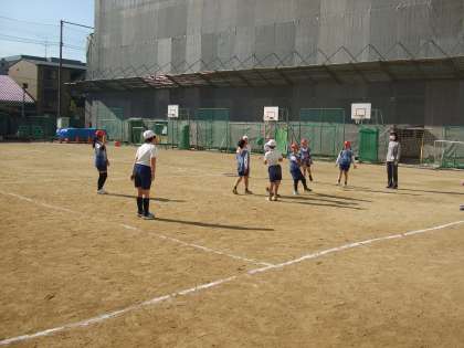3年生では、体育科でボール運動をしていました。コートの四隅にフラフープが置いてあり、パスでそこまでボールを運ぶことができれば得点になるようです。