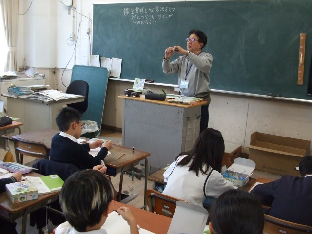 3年生では、理科で「豆電球と乾電池」の学習をしていました。実験キットを使い、乾電池にどのように導線をつなぐと明かりがつくか確認していました。