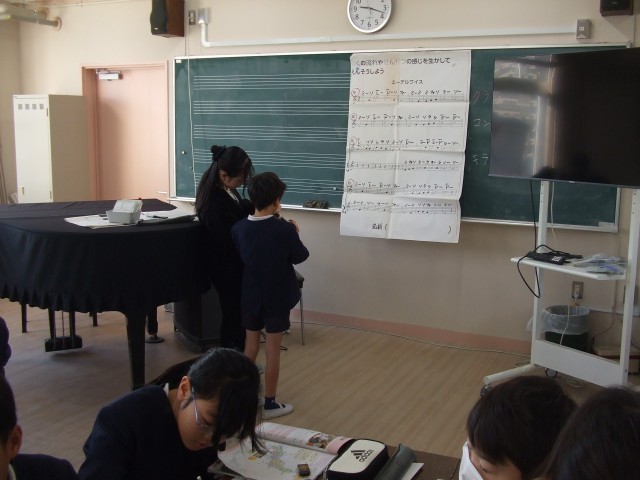 4年生では、音楽科でリコーダーのテストをしていました。曲目は「エーデルワイス」です。リコーダーの指のおさえ方に気をつけながら、のびやかに演奏できるように頑張っていました。