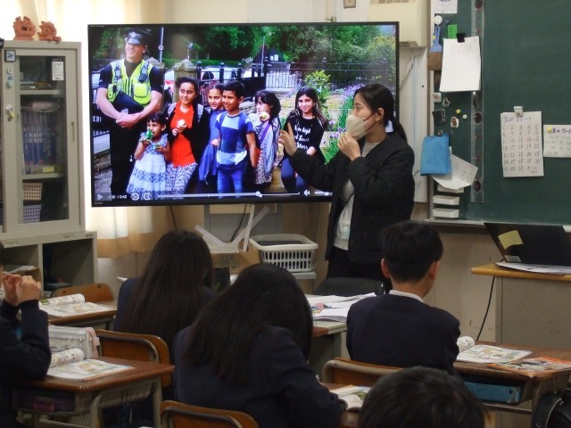 5年生では、外国語科の学習で世界の国々の町の様子について学習していました。映像から聞こえてくる英語を聞き取り世界の町の特徴について考えていました。