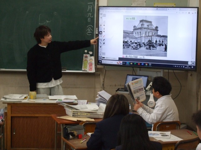 3年生では、社会科で「大阪市のうつりかわり」について学習していました。約100年前に撮られた大阪駅の写真から当時の様子を想像していました。