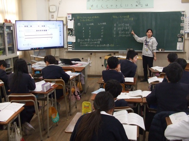 5年生では、算数科で「割合」の学習をしていました。割合を求めシュートが一番よく成功している人が誰になるのかについて考えていました。