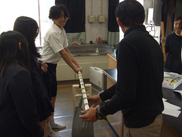 6年生では、理科で「てこ」の学習をしていました。5kgのおもりを棒で持ち上げる時に持つ場所によって力のかけ方が変わることを体験していました。
