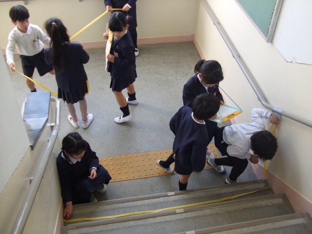 2年生では、算数科で学校内の色んな場所の長さを紙テープを使って測る学習をしていました。1mの長さの感覚が次第に分かるようになっていました。