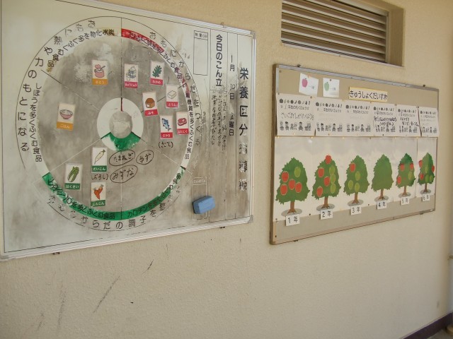 平野南小学校では、「きゅうしょくだいすき週間」として、各学級にて1週間の給食目標を設定し、目標を達成することができれば、給食室に掲示している「き」に「りんご」を貼る取り組みを実施しています。