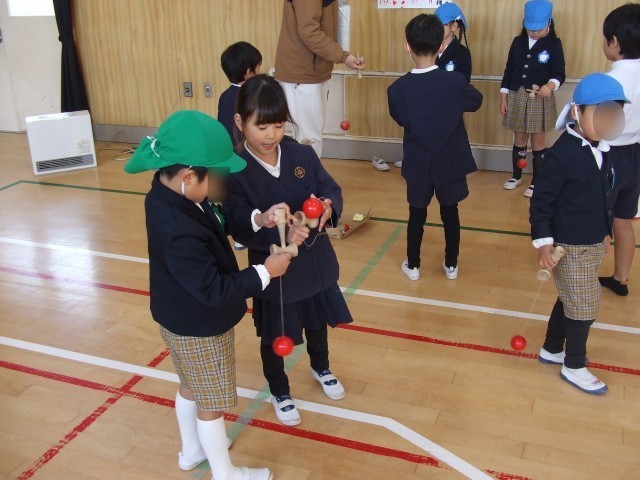 講堂に戻ってからは昔遊びの体験を通し交流会を実施しました。