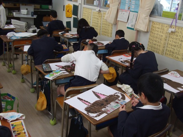 2年生では、図工科で物語の様子を絵で表す学習をしていました。クレパスを使ってていねいに色を塗っていました。