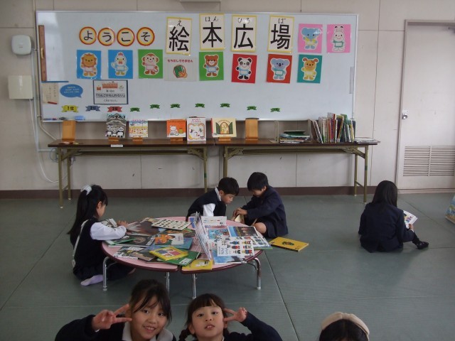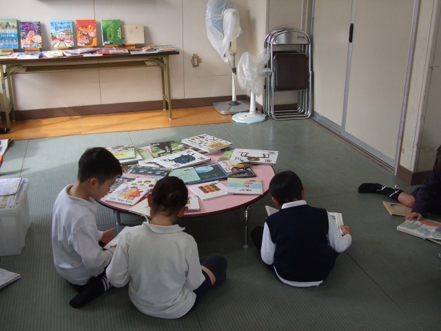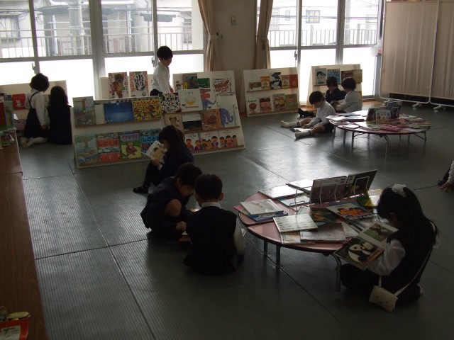 今週はたたみの部屋を活用して「絵本広場」の取り組みを実施しています。平野図書館から350冊の絵本をお借りし、本に親しむ機会を設けています。授業の時間だけでなく、15分休みや昼休みにも開放していますので、ぜひ絵本を手に取って物語の世界に浸ってほしいと思います。
