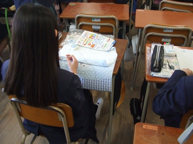 5年生では、家庭科で「ナップザック」の制作をしていました。ミシンで縫うときにずれないようにしつけ縫いをしていました。