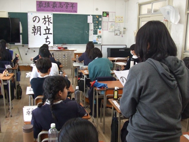 6年生では、書写の学習をしていました。半紙に「旅立ちの朝」と毛筆で書いていました。五文字なので字の大きさと配置に苦戦していました。