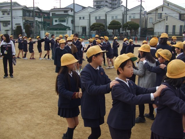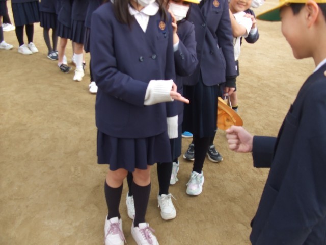 運動場で「じゃんけん列車」をしました。はじめにペアでじゃんけんをしてから始めました。最後の方になるととても長い列になっていました。