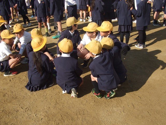 今回は「もうじゅうがり」のゲームをしました。「アメリカザリガニ」など発表される動物の名前の文字数を数え、文字数にあった人数で輪を作ります。
