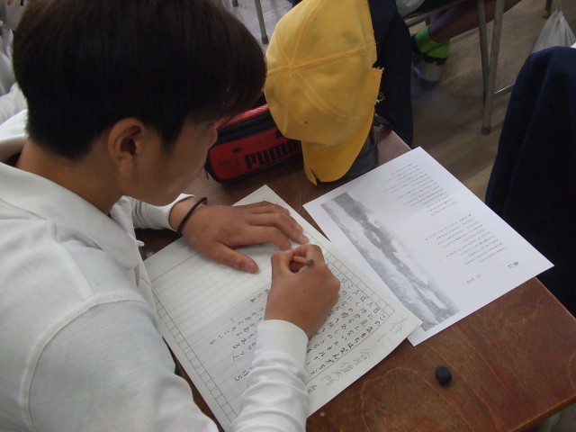 6年生では、国語科で詩の視写学習をしていました。みんな姿勢よく集中して美しい字を書いていました。