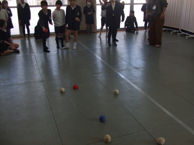 なかよし学級では、5時間目に多目的室に集まり「なかよしタイム」の活動をしていました。玉入れの紅白玉を活用してボッチャ大会をしていました。的の近くに玉を投げることができた時に嬉しそうにしていました。