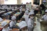 1年生は、はじめての給食です。先生のお話を聞いて、準備をしています。メニューは、...