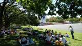 万博記念公園に着きました。天気がよくて、とても気持ちのいい青空です。